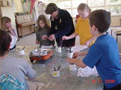 Students will make a batik handkerchief or picture on cloth. Senior Primary and Secondary College students will use the traditional hot wax on cloth. Junior Primary will use the cold wax method.